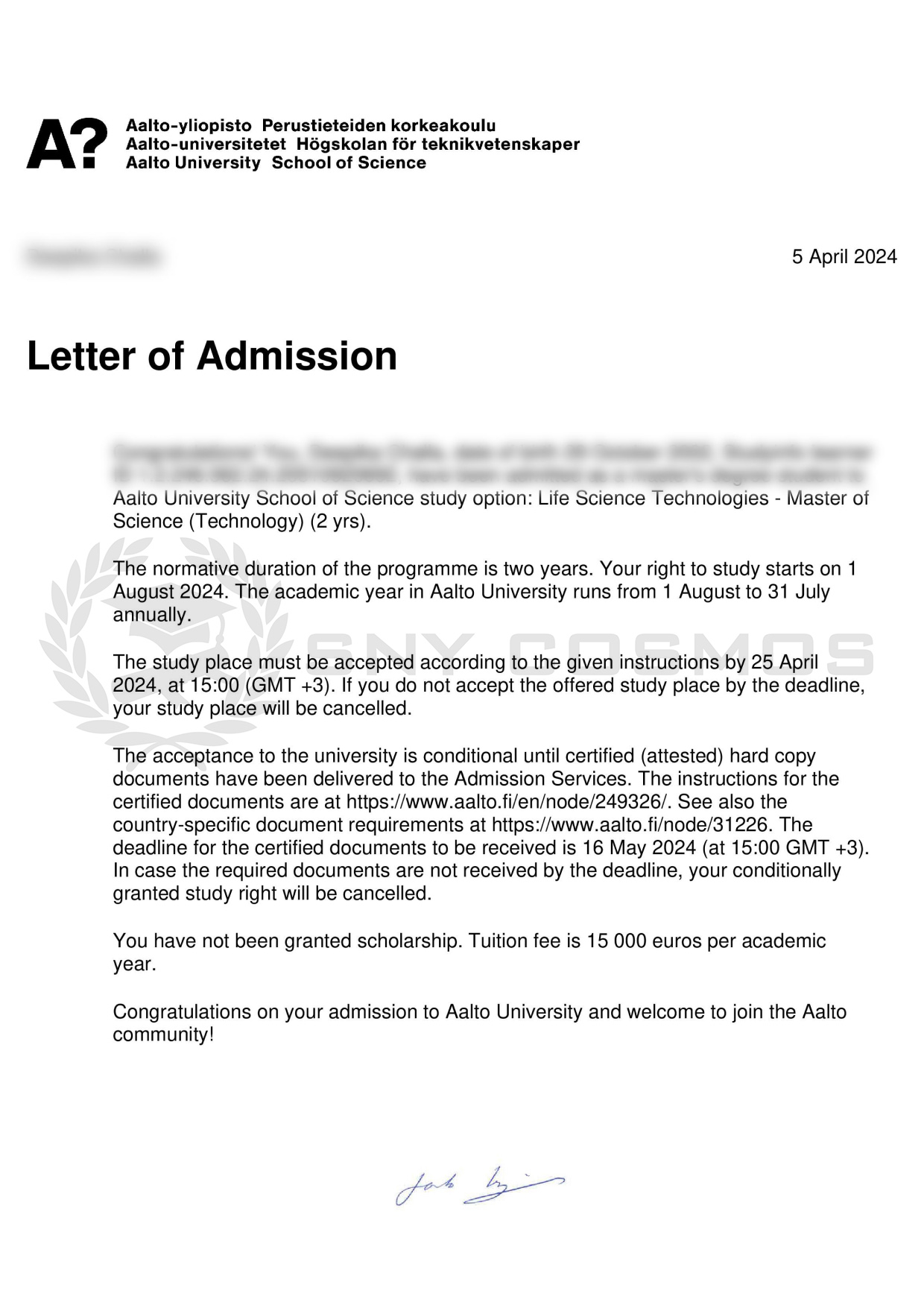 I am a graduate of NIT Rourkela and I got my admit in Politecnico Di Milano, Italy to purse masters in materials engineering and nanotechnology. I would like to sincerely thank the entire team of Sny Cosmos for assisting me in my admission process and visa process. The entire process is hassle-free. My sincere thanks to them for helping me throughout the process with their experience. They have been really patient and helpful throughout the process and clarified my each and every query. They helped me choose the perfect university of my requirements and interests. They are very attentive and followed up my process on a daily basis. I blindly suggest this consultancy if you are aspiring to pursue masters in abroad.WORTH EVERY PENNY