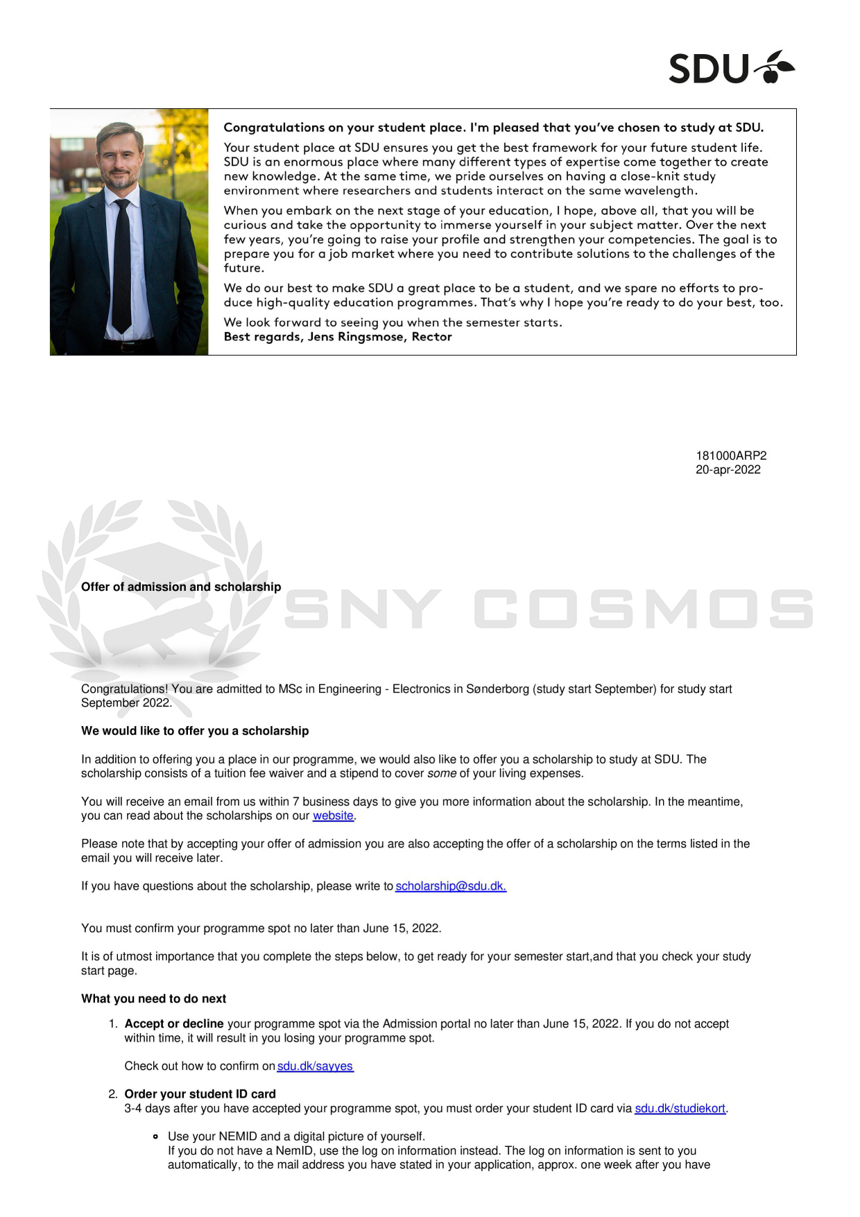 Hi, this is Pavan from Yanam. My journey with Sny Cosmos went for almost a year. The counsellors and staff were very friendly and helpful and supportive. Due to the pandemic and also my native place is very distant from the offices of Sny Cosmos, I haven't had the chance to visit their offices in person, and amid all these obstacles all my processes like application, admission, getting a scholarship, and visa applications etc, were done online and all were successful. I got a 100% scholarship for my 2 years of Master studies in Denmark and received my visa to pursue my studies. SNY Cosmos Team were always available whenever I had any doubts or queries. I am very thankful to Sny Cosmos.